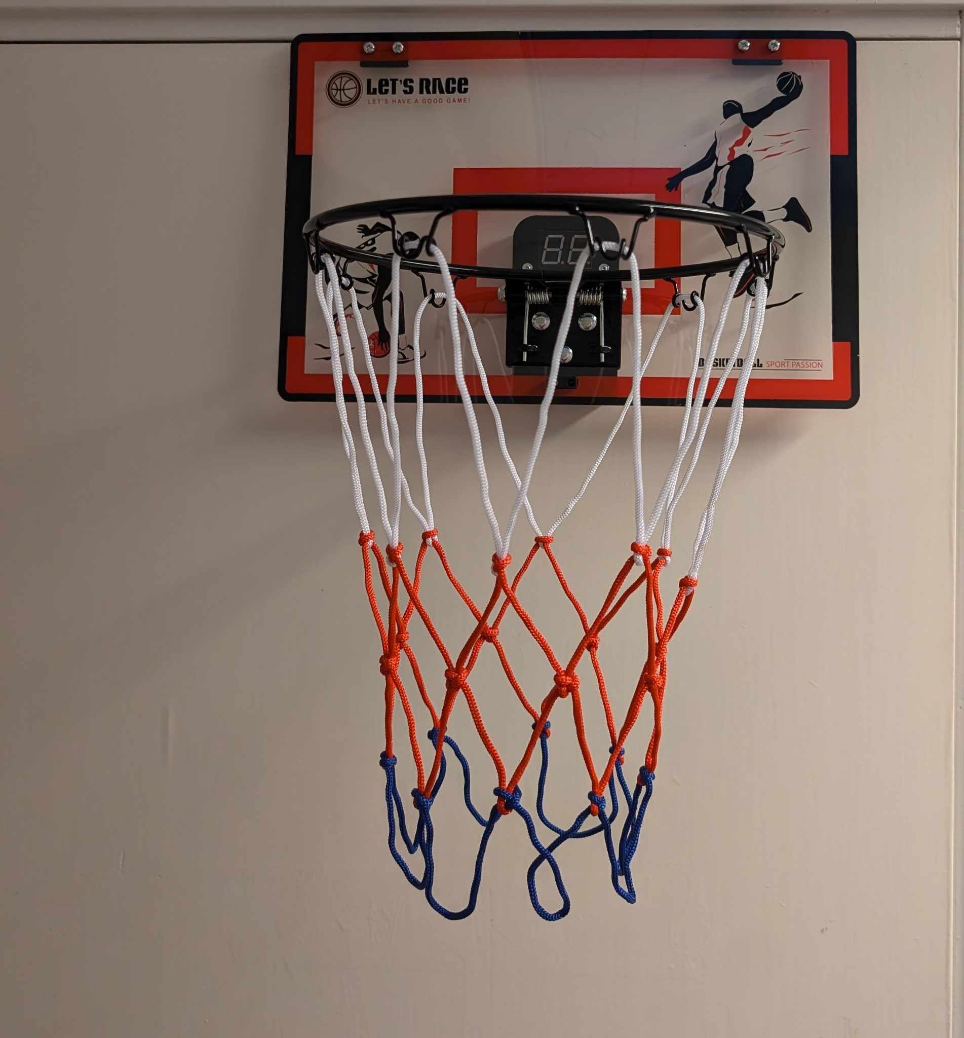 Basketkorgen kan hängas över en dörr inomhus.